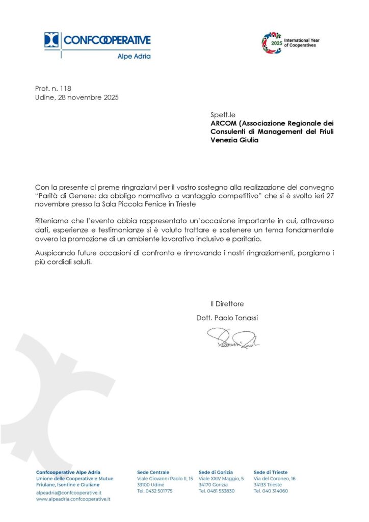 Il 27 novembre 2025 ARCOM e i suoi associati hanno preso parte al convegno “Parità di genere: da obbligo normativo a vantaggio competitivo”, tenutosi a Trieste presso la Sala Piccola Fenice e promosso da Confcooperative Alpe Adria.